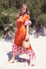 This dress is printed in our enchanting "Aluala" print, a fusion of bold colors and intricate details that exude elegance and charm. Warm, vibrant orange bursting with suns that evoke warm summer days, with the feminine pink contrast hem giving a signature JRF quirky twist.