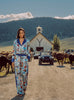 The Lounge Pants in Western Blues bring a sense of freedom to silk tailoring. Set against a soft sky-blue ground, hand-illustrated cowboy boots, horses, cacti, guitars and horseshoes create a playful yet elevated print story. It feels nostalgic, but styled with intention.