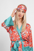Crafted from the finest silk, this luxurious piece is adorned with a captivating tapestry of fantastical creatures and celestial elements, evoking a sense of wonder and enchantment. A vibrant coral backdrop sets the stage for a playful dance of graceful cranes, their elongated necks and delicate forms contrasting with the bold, swirling motifs that evoke both oceanic depths and starry skies.